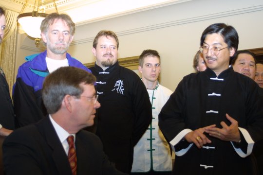 | Master Lu extolls the health benefits of Tai Chi and Qigong and invites Governor Leavitt to join him in his early morning class. | ||||||||||